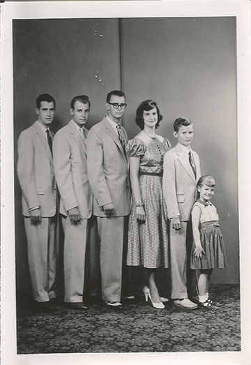 A photo of my family taken a few years before I went to school in Switzerland. Pictured from left to right are Bud, Dick, Bob, me, Frank, and Susie. Bob is sometimes omitted in my regards because he was in school at the University of Eastern New Mexico at that time. My sister, Susie, was nine years old and remembers our father reading my letters to her when they would arrive!